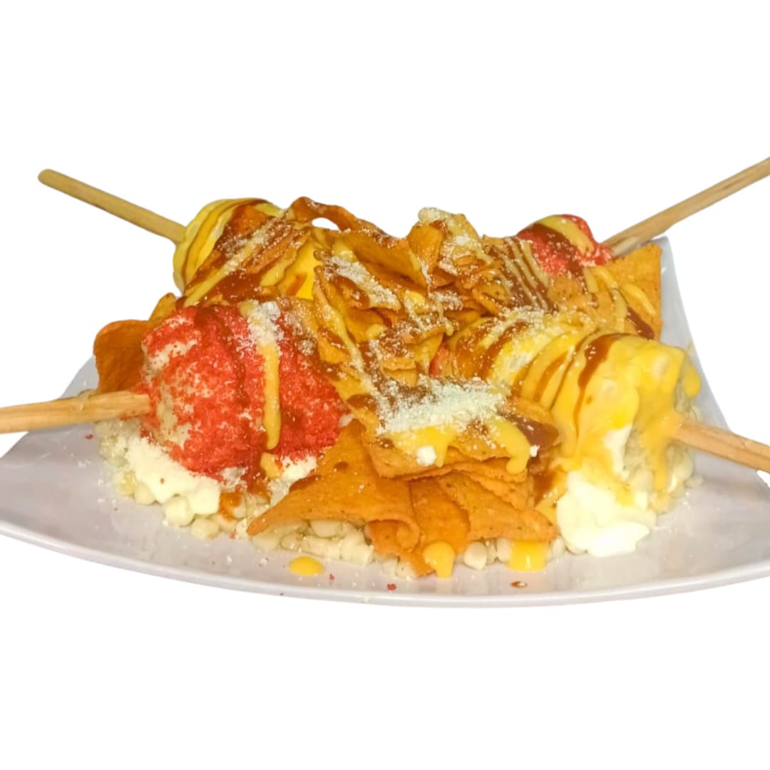 1 elote revolcado de fritura,1 elote bañado en queso cheddar, porción grande de esquite, 1 bolsa de frituras,queso hebra, y queso cheddar.